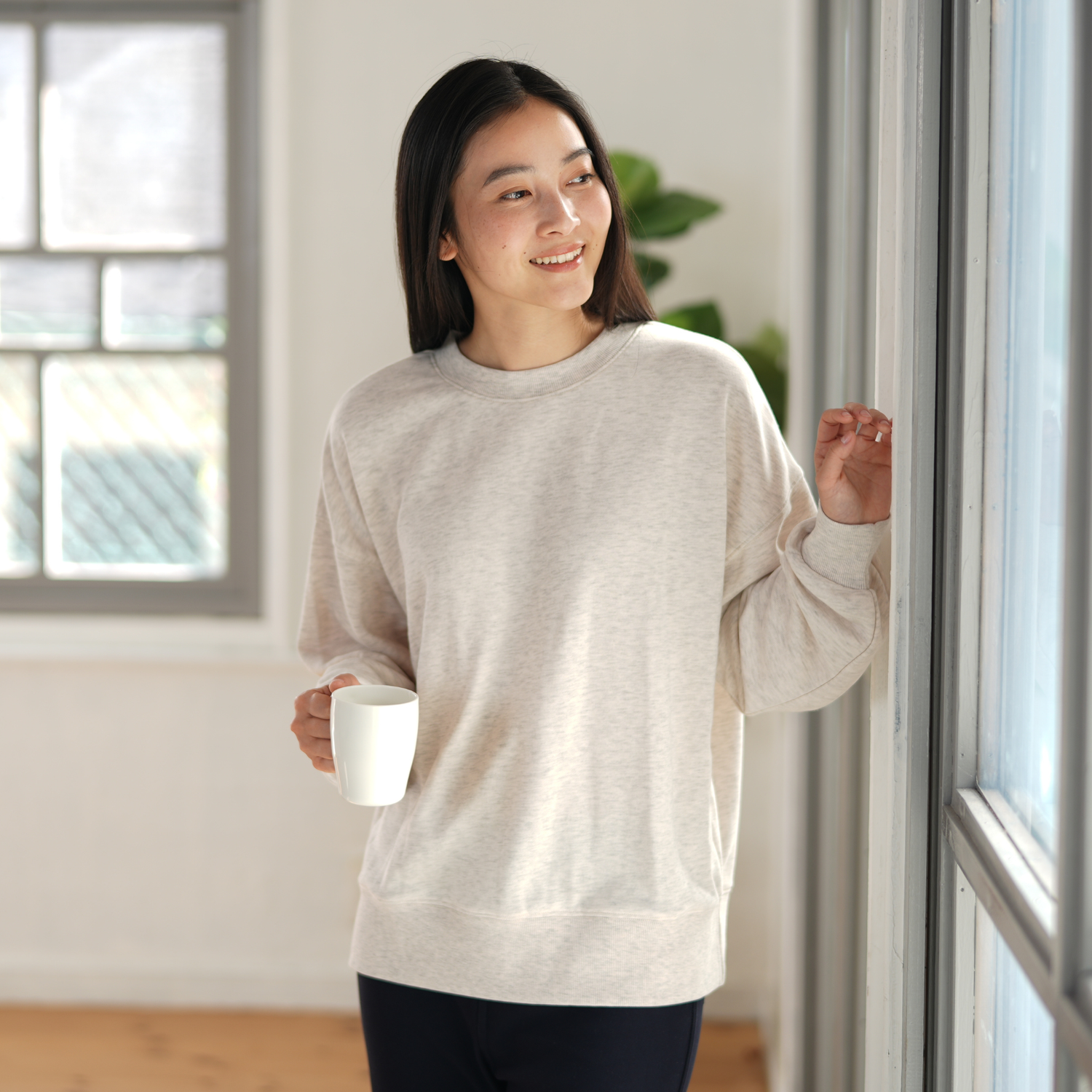 袖を通した瞬間、心までほぐれるような柔らかさ。 「ふんわりタッチスウェット」は、毎日着たくなる心地よさと、忙しい毎日に嬉しい機能性を両立させた、大人のための定番プルオーバーです。