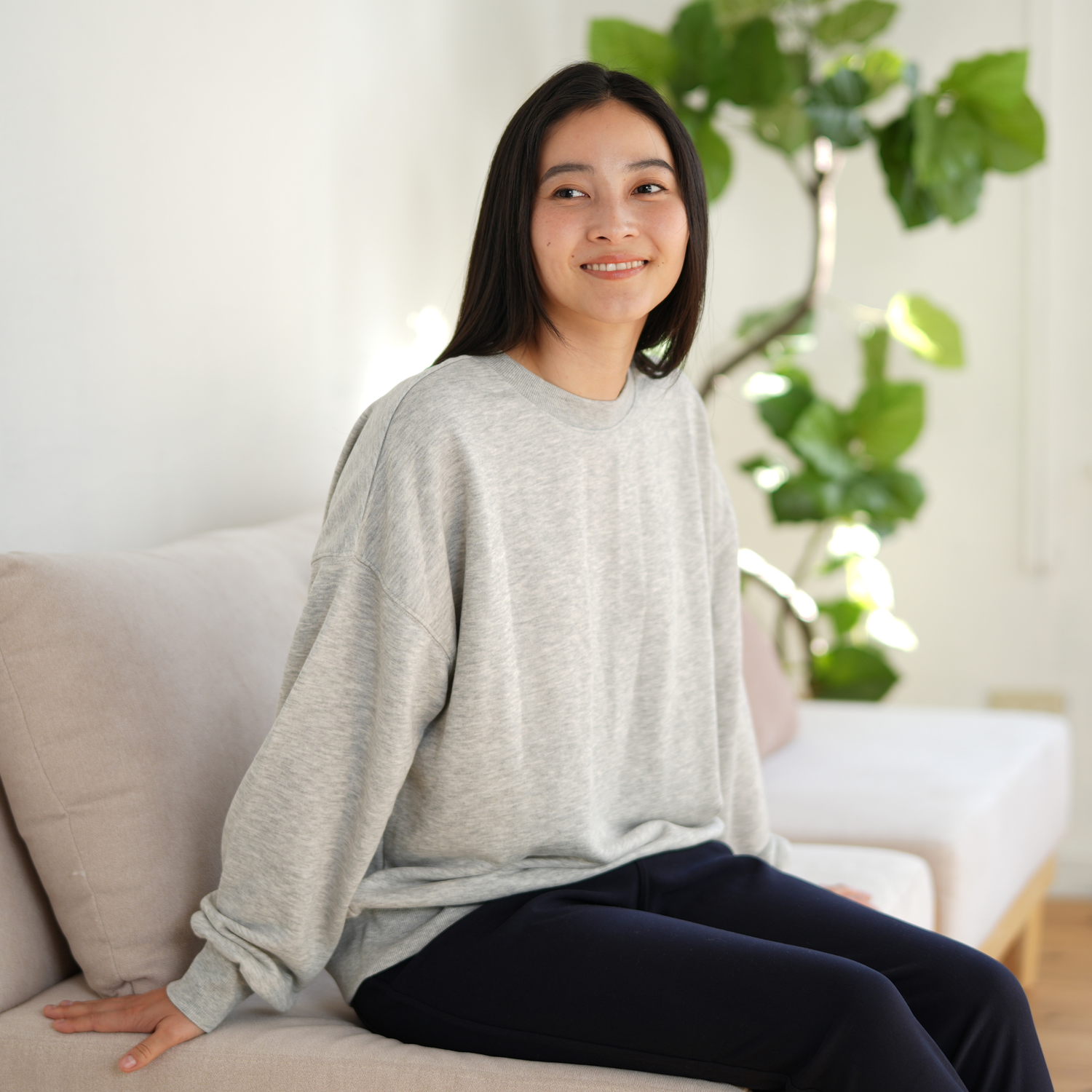 独自の「ふんわり生地」を採用。空気をたっぷり含んだような軽やかさと、ずっと触れていたくなるなめらかな肌ざわりを実現しました。重いスウェットが苦手な方にもおすすめの、ストレスフリーな着心地です。