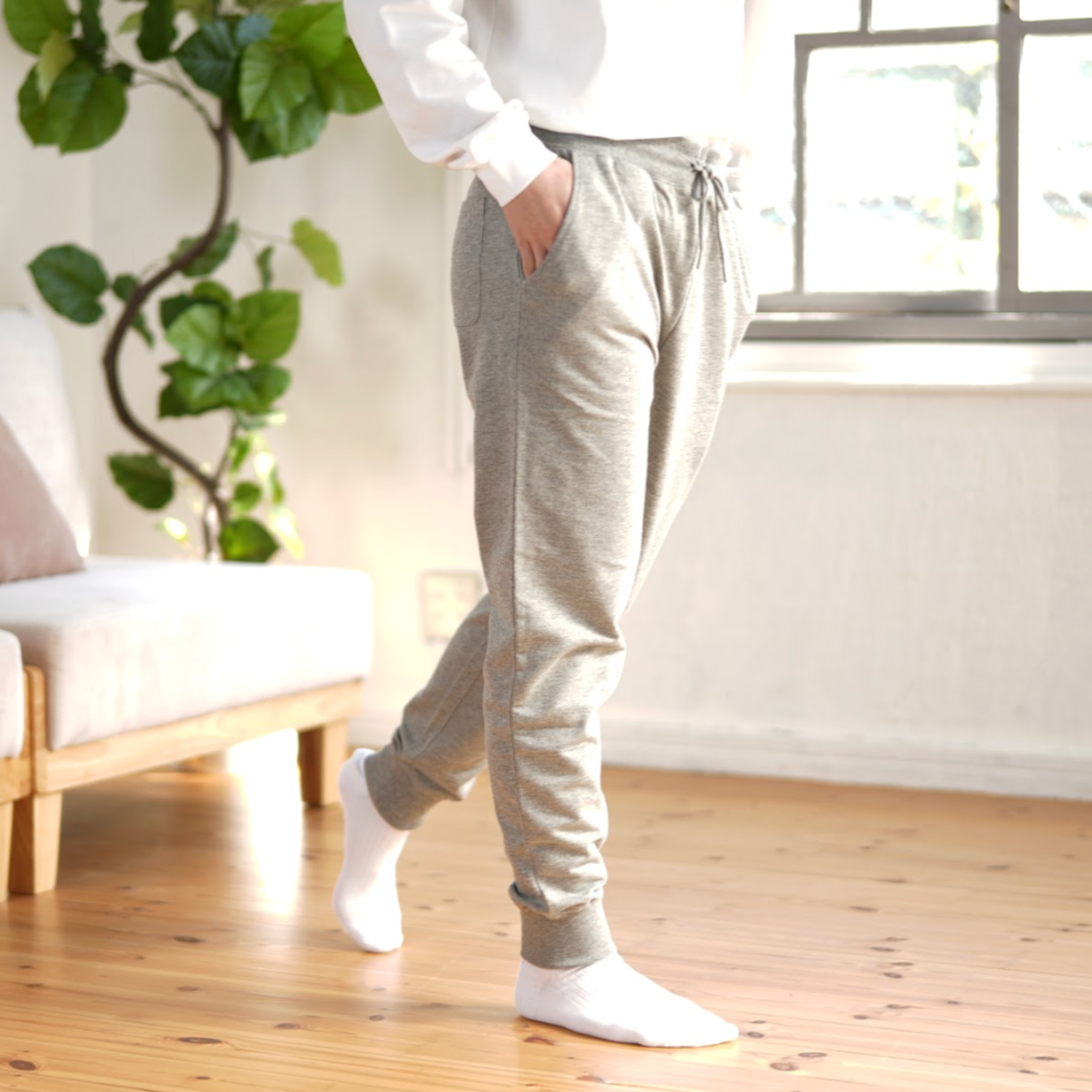 足元をすっきりと見せるテーパードシルエット。スウェット特有の「もたつき」を抑え、スマートな印象を与えます。抜群のストレッチ性で、長時間の着用でも膝抜けしにくく、美しいラインをキープします。