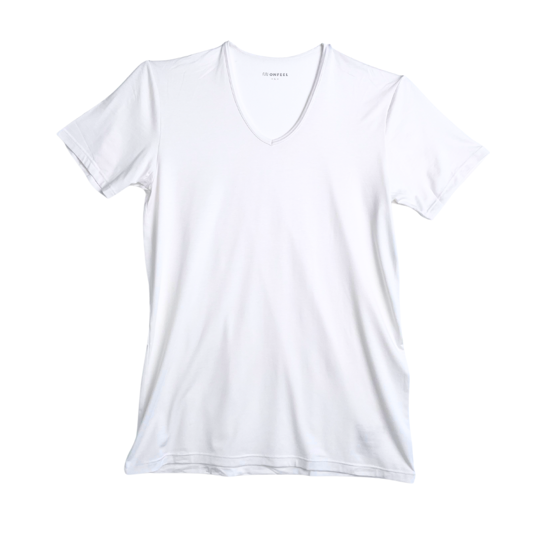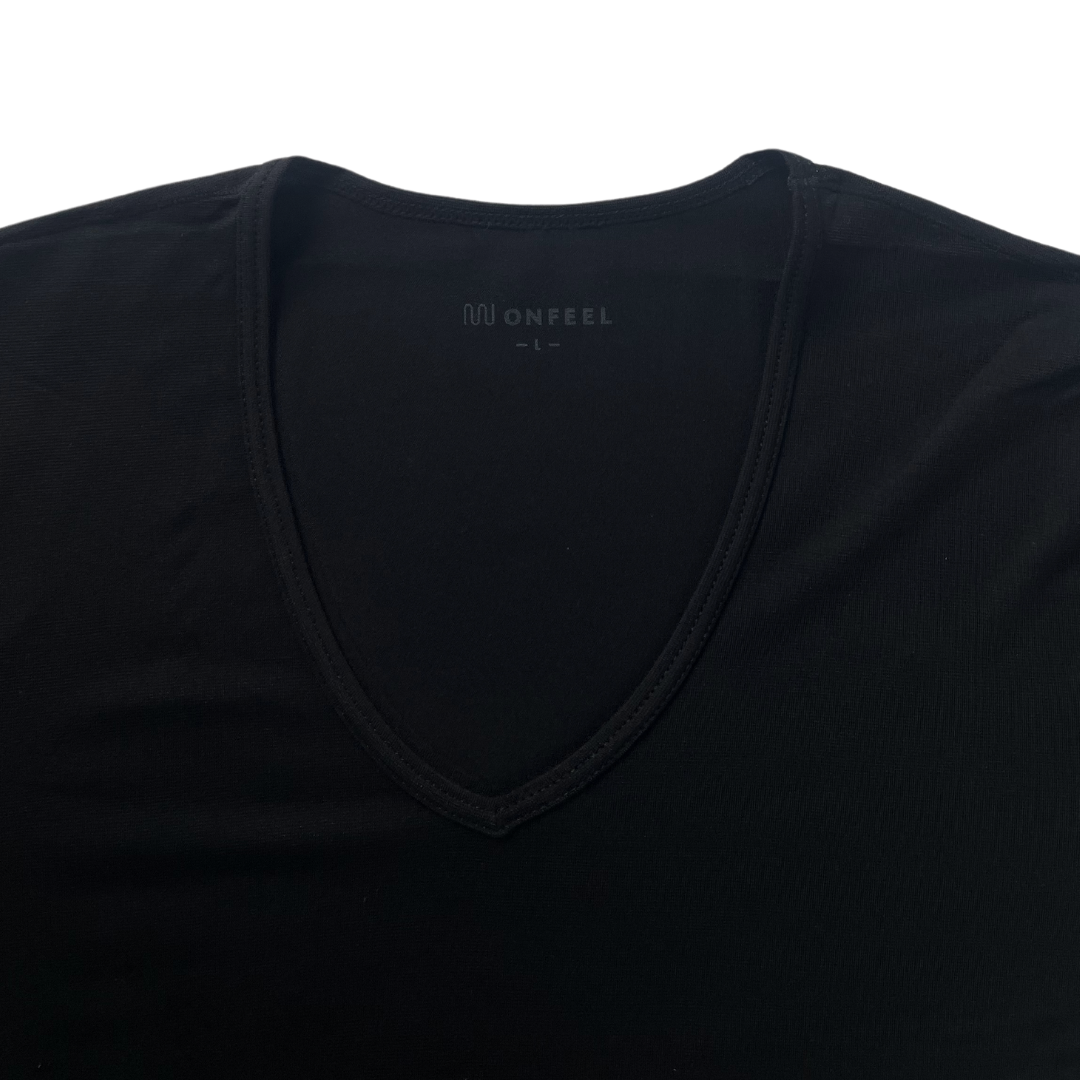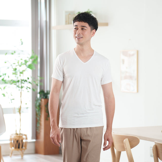 半袖デザインで動きやすく、袖部分がごわつきにくいです。シャツの下に来ても襟から見えにくい、適度な襟の深さ。ビジネスシーンで大活躍のVネックデザイン。室内で長袖だと暑いときに重宝する半袖インナーです。