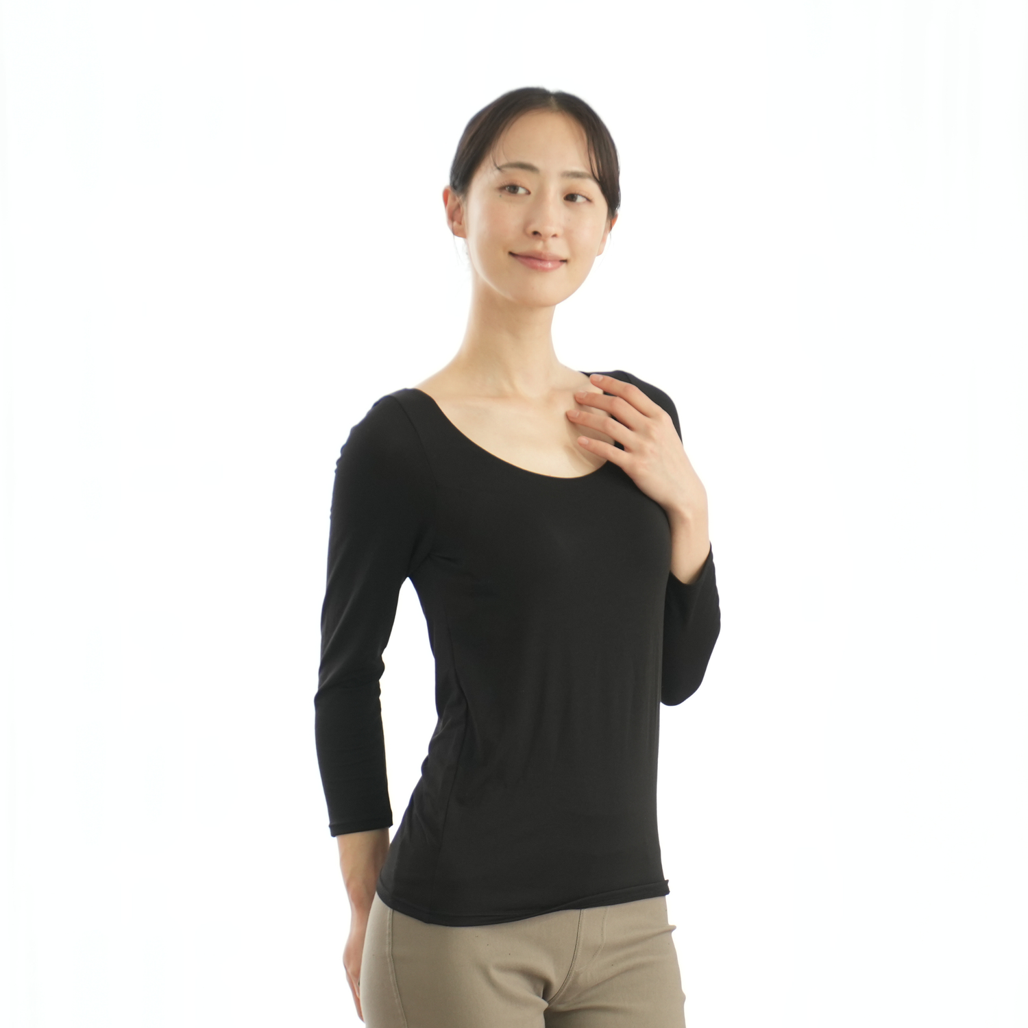 程よく開いたネックラインでアウターから見えにくいデザイン。静電気が起きにくいから不快なパチパチが発生しにくく安心