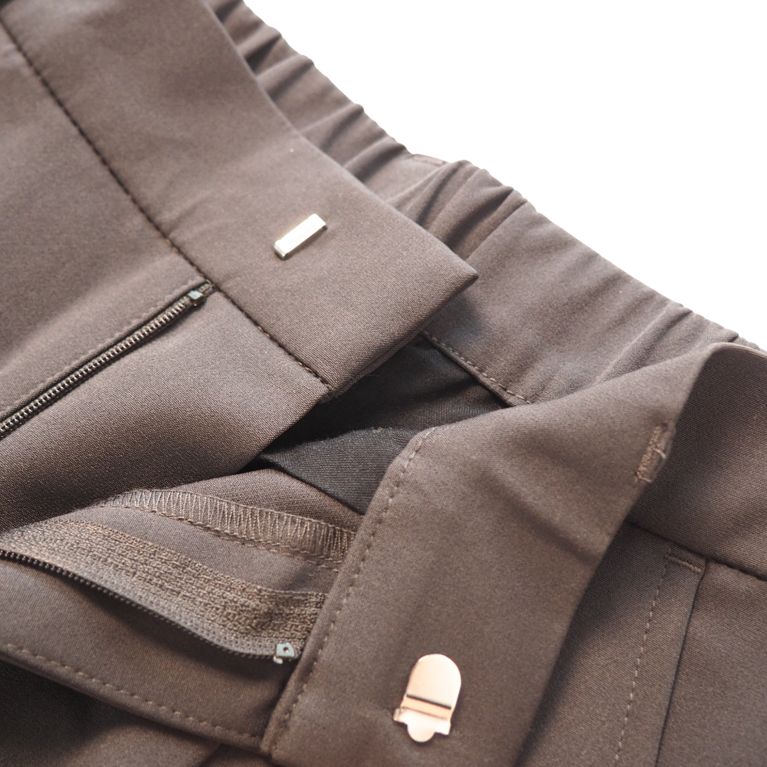 - ファスナーの比翼とハイウエストがすっきり魅せ。