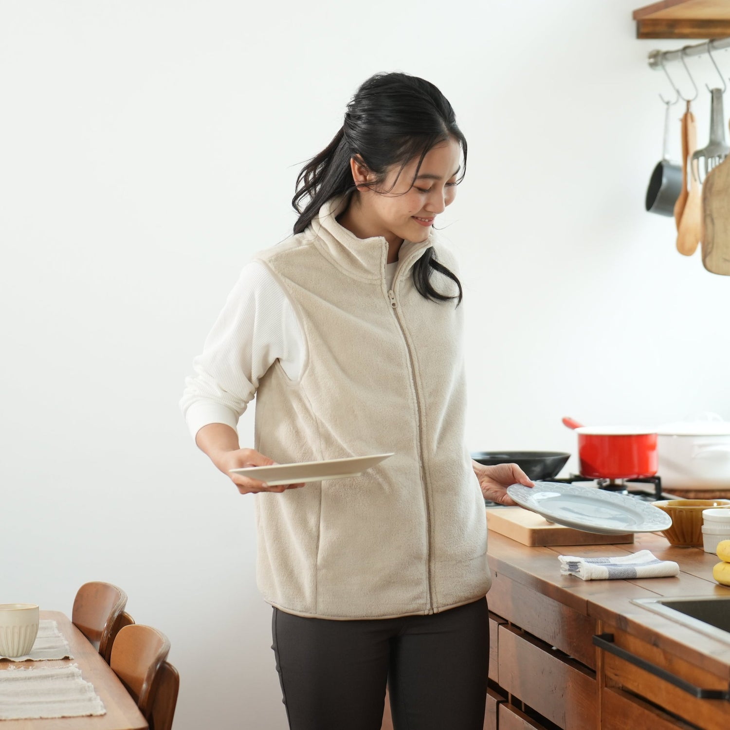 肩回りの窮屈感もなく寒さ対策もしつつ動きやすさも備えたアイテムです。室内のお仕事着や軽作業着におすすめです。