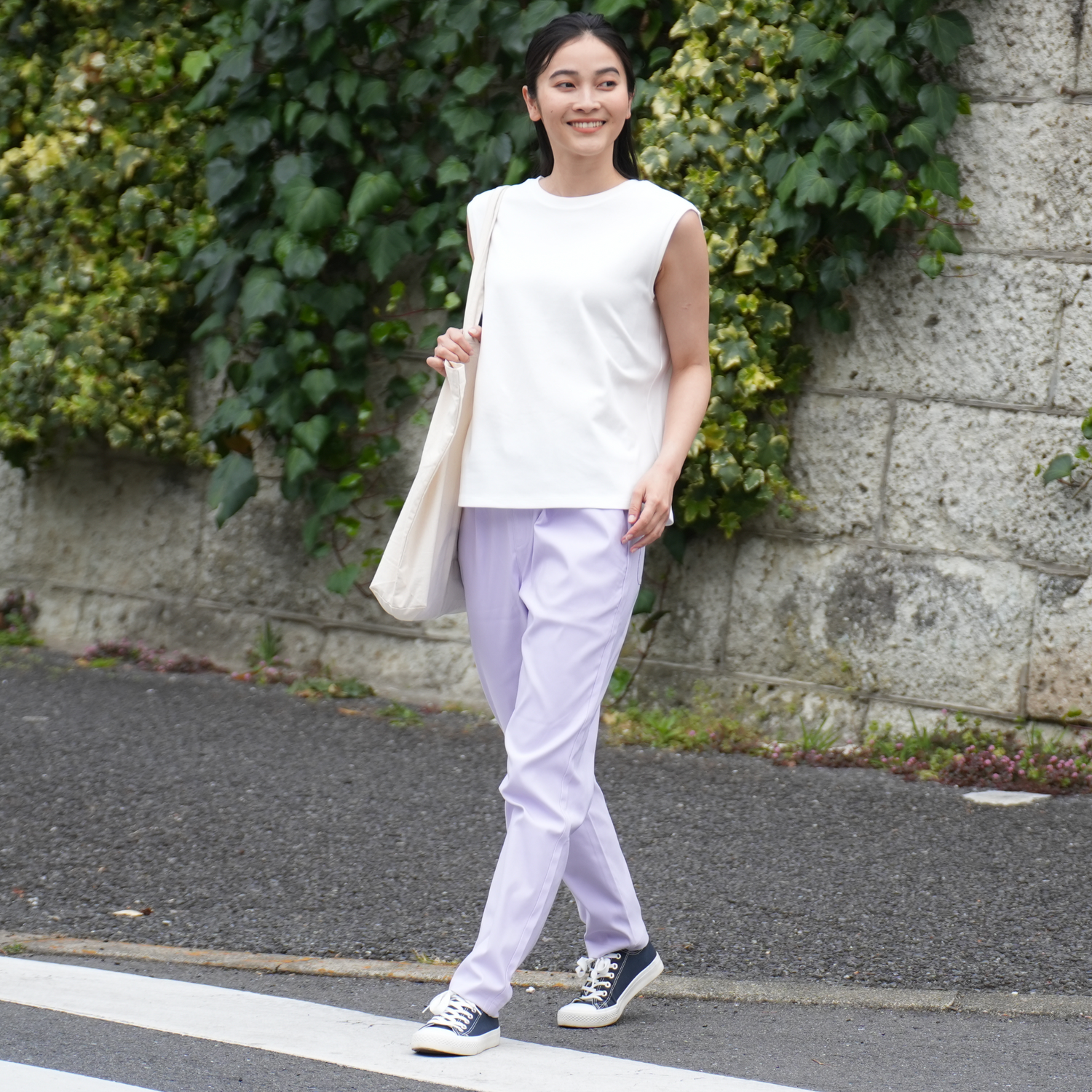 どんなスタイルにも合わせやすいほどよくゆとりのあるテーパードパンツ。